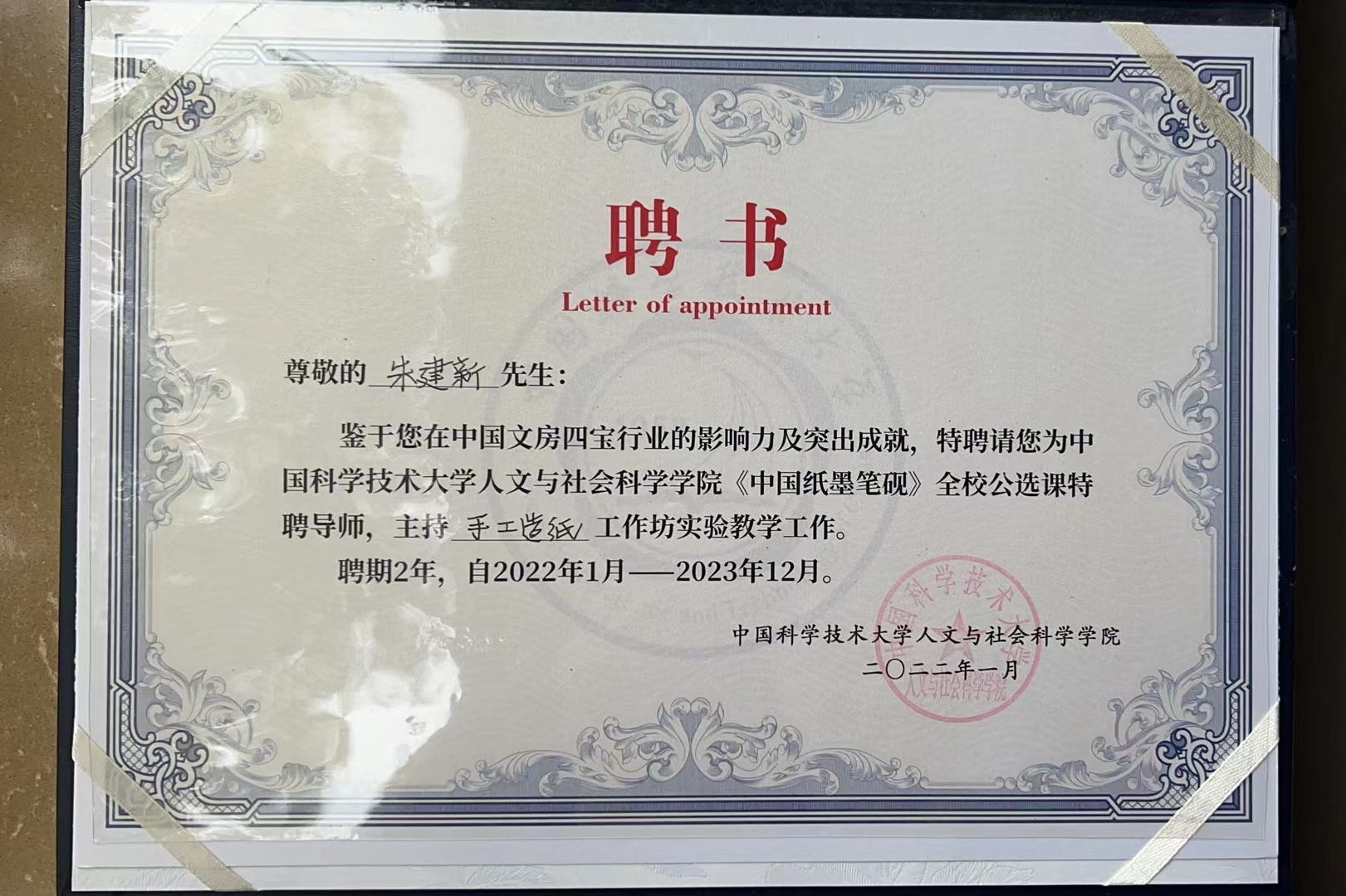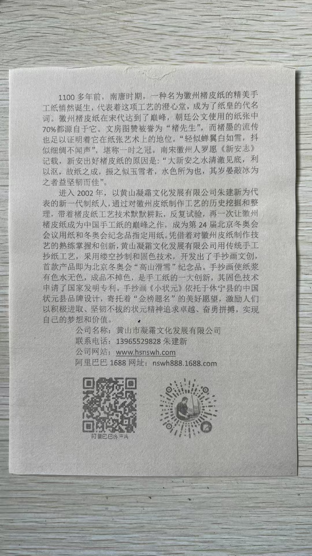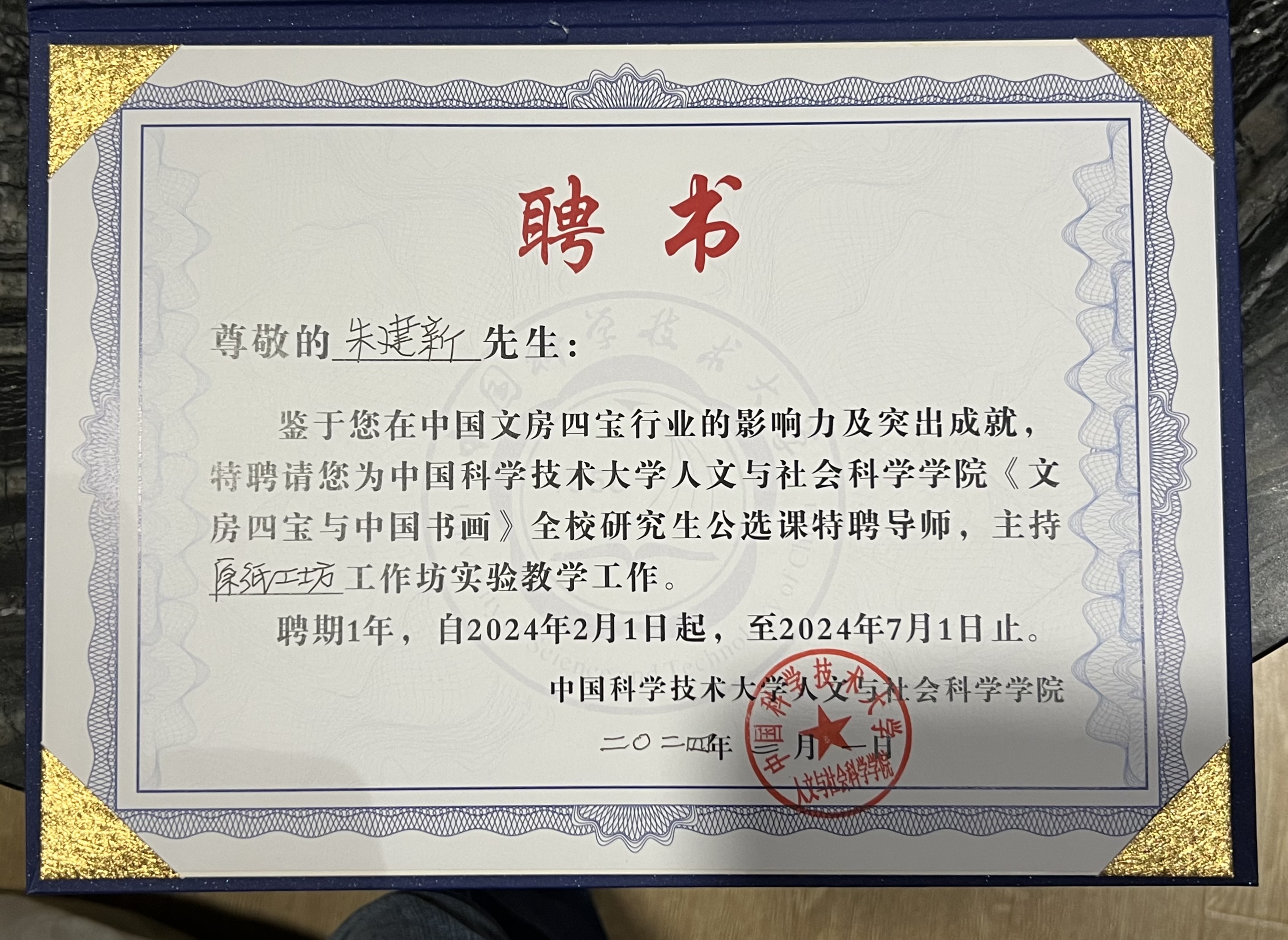 2020年公司實現(xiàn)了文化類規(guī)上企業(yè),迄今已申請了15項發(fā)明專利,19項實用新型專利,其中已授權(quán)發(fā)明專利3項,實用新型專利11項;2022年,公司為北京第24屆冬季奧運會提供楮皮紙和紀(jì)念品,非遺傳承人朱建新被授予北京2022年冬季奧會參與證書,以感謝第24屆冬奧會取得圓滿成功做出的貢獻。2022年-2024年,朱建新被中國科技大學(xué)聘為《中國筆墨紙硯》全校公選課特聘導(dǎo)師;2023年,朱建新獲省級非遺傳承人稱號、“黃山工匠”稱號。